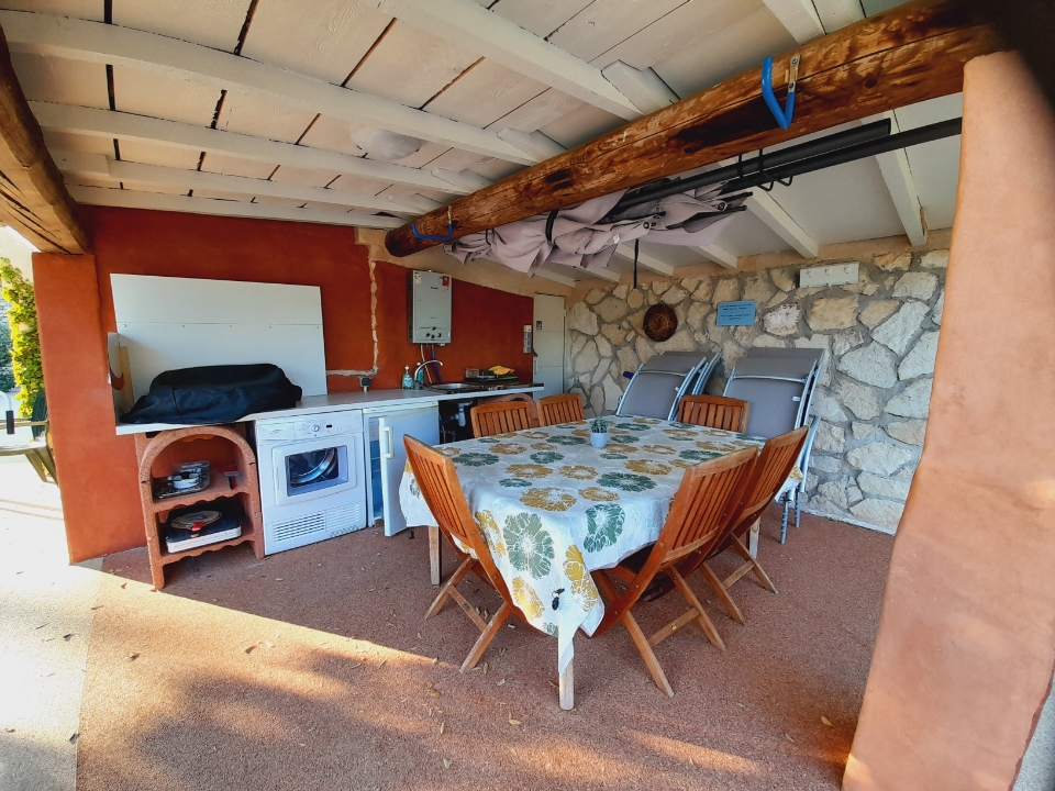 The house has 3 bedrooms, one of which is very special, 3 bathrooms, one of which is outside, a fully equipped kitchen, a bright veranda, a swimming pool with a dining area and an outside kitchen. It can accommodate 6 people in options up to 10 people